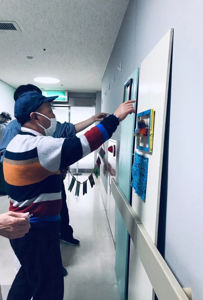 病院に用事がなくても、展示を見に来るだけでも大丈夫です。一階奥の、ミニストップとレストランの間の通路で展示しております。